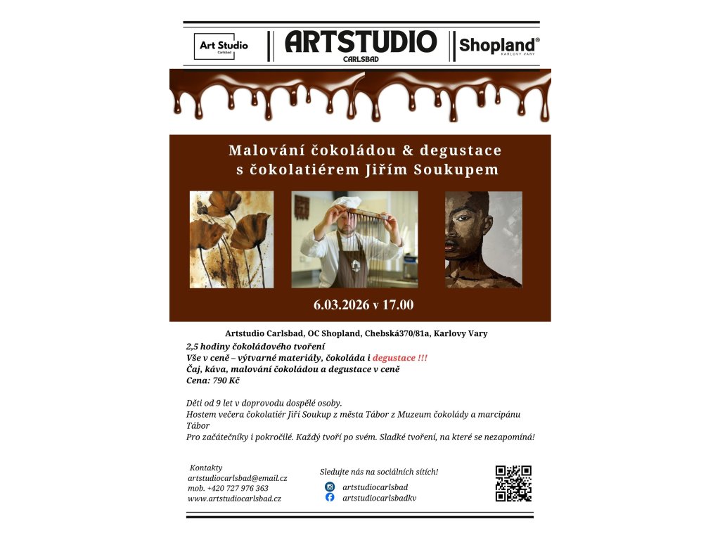 Součástí workshopu je degustace čokolády, se kterou budeme také malovat. Budeme tvořit obrazy ze tří druhů čokolády a poznáme jejich chuť, vůni i strukturu.